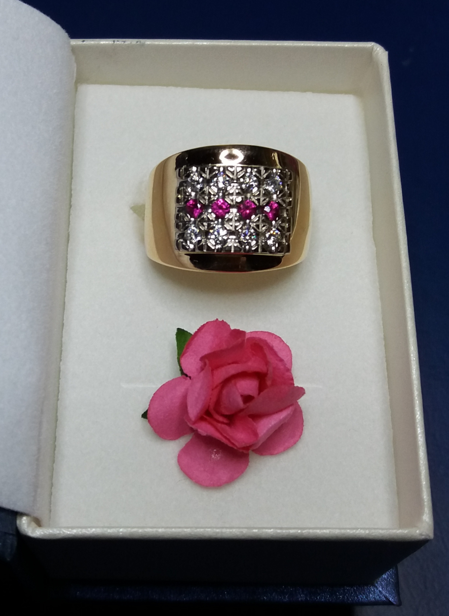 Keltakultainen sormus timanteilla ja rubiineilla 2