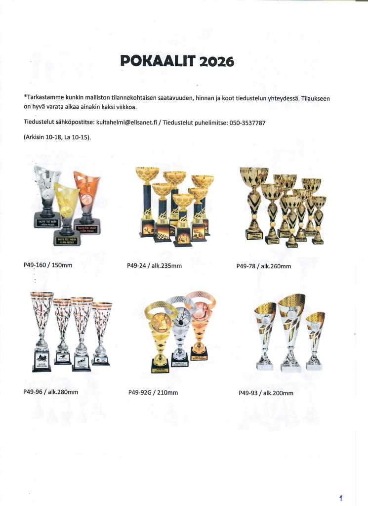 Tarkastamme kunkin malliston tilannekohtaisen saatavuuden, hinnan ja koot tiedustelun yhteydessä. Tilaukseen on hyvä varata ainakin kaksi viikkoa. Tiedustelut sähköpostitse: kultahelmi@elisanet.fi / Puhelimitse: 050-3537787 (Arkisin 10-18, La 10-16)