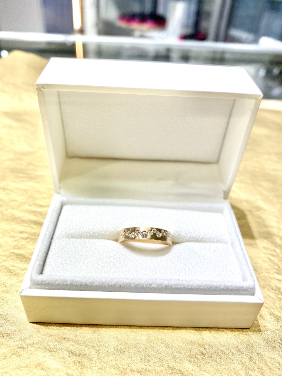 Tilaustyö Keltakultainen sormus Timanttipuro. Kierrätettyä kultaa ja timantteja. Kuvien navigointi Edellinen Seuraava